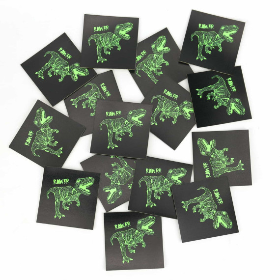 1 tolles bedrucktes Kunstleder Label in Schwarz und Neongrün mit coolem Dinosaurier und passendem "RAWRR" Schriftzug.