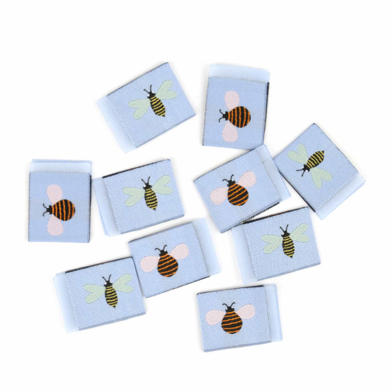 Hier ein hellblaues Label mit einer Biene und auf der Rückseite mit einer Hummel.