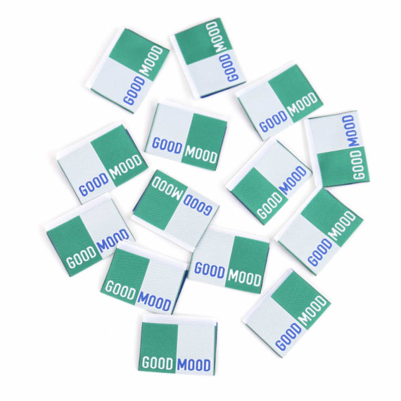 Hier ein zweifarbig geteiltes Label in Weiß und Grün mit dem Schriftzug "GOOD MOOD" in Blau und Weiß. Die Farben kehren sich auf der Rückseite um.