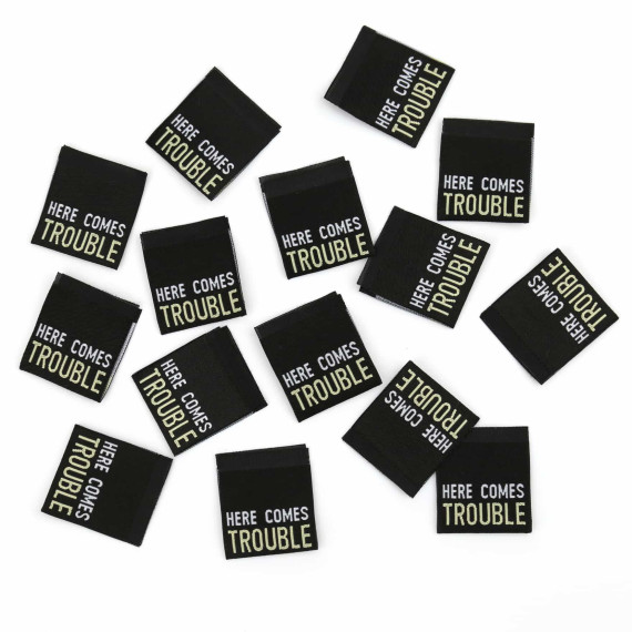 1 tolles gewebtes Label mit Mittelfaltung zum in die Naht Einnähen! Hier ein schwarzes Label mit "HERE COMES TROUBLE" Schriftzug in Weiß und Pastellgelb.