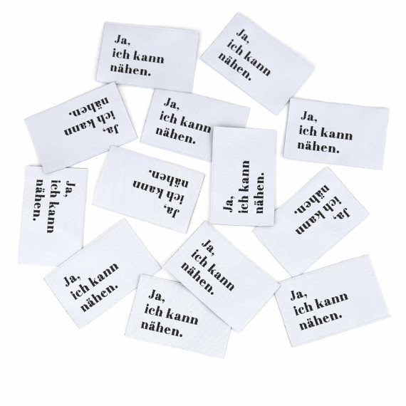 Hier ein Label in Weiß und dem Text "Ja, ich kann nähen." in Schwarz.