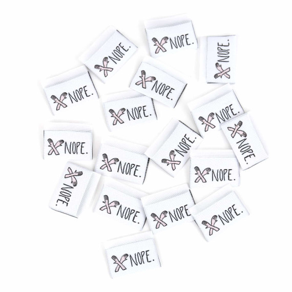 Hier ein Label mit dem Text "NOPE" in Schwarz und gekreuzten, blassrosafarbenen Händen auf einem weißen Hintergrund.