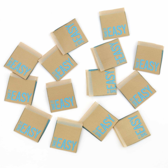 1 tolles gewebtes Label mit Mittelfaltung zum in die Naht Einnähen! Hier ein hellbraunes Label mit "TAKE IT EASY" Schriftzug in Cyanblau.