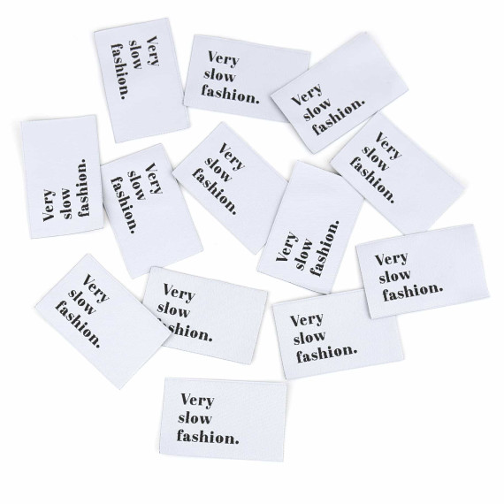 Hier ein Label in Weiß und dem Text "Very slow fashion." in Schwarz.