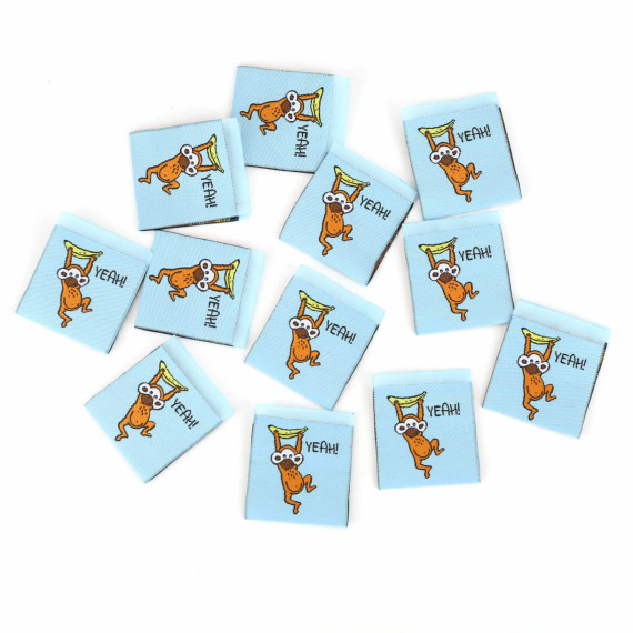 Hier ein Label in Türkisblau mit einem Affe und dem Wort "YEAH".