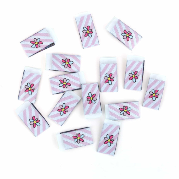 Hier ein Label mit Schrägstreifen in Pastellblau und Flieder und einer bunten Blüte.