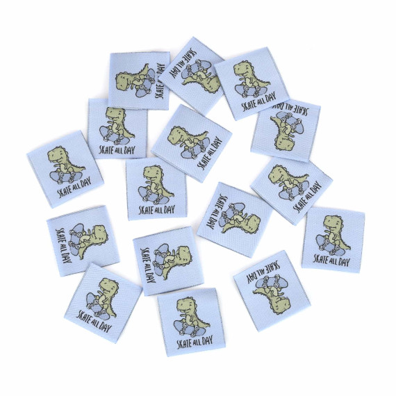 Hier ein Label in Hellblau mit coolen Skater-Dino und dem Text "SKATE ALL DAY".