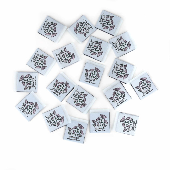 Hier ein Label mit den Wörtern "FLOWER love" und Blumen