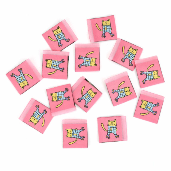 Hier ein Label in Lachsrosa mit einer Katze die Rollschuh fährt.