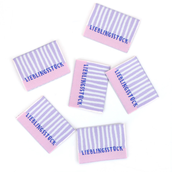 Hier ein Label mit Längsstreifen in Weiß und Flieder mit der Aufschrift "LIEBLINGSSTÜCK"