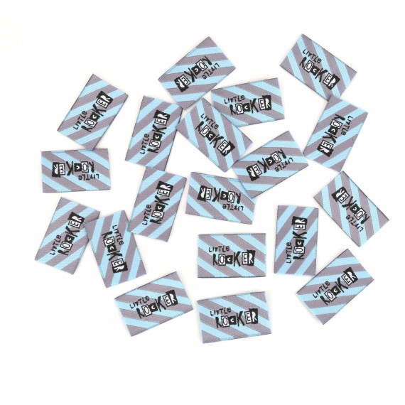 Hier ein Label mit Schrägstreifen in Grau und Türkisblau und dem Text "LITTLE ROCKER".