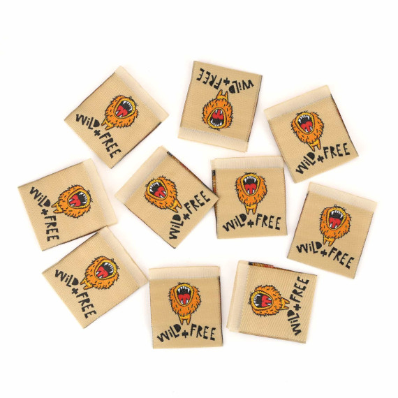 Hier ein Label in Ockerbraun mit einem brüllenden Löwen und den Worten "WILD + FREE".
