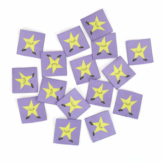 Hier ein Label in Altlila mit einem Stern in Turnschuhen.