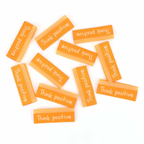Hier ein Label in Gelborange mit dem Text "Think positive".