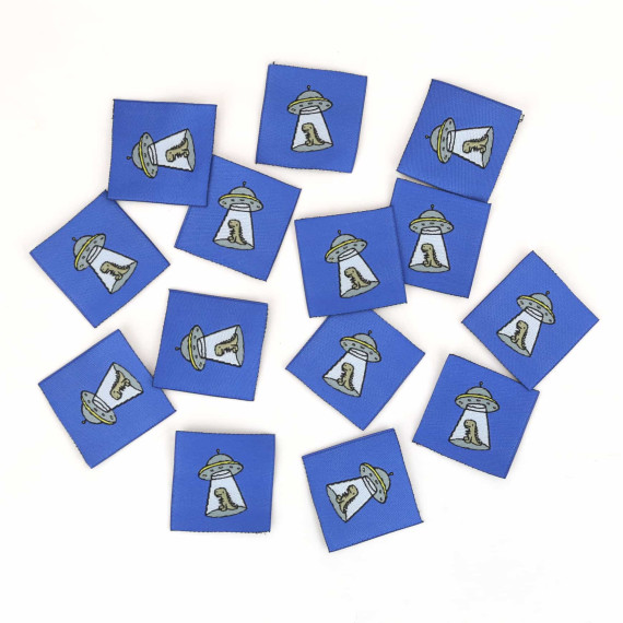 Hier ein Label in Royalblau mit einem Ufo, dass einen Dino im Lichtkegel hat.