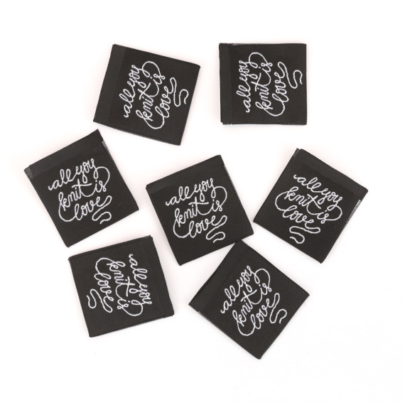 Hier ein Label mit dem Text "all you knit is love" in Weiß auf einem