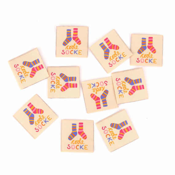 Hier ein Label in Beige mit dem Text "coole Socke" und einem gestreiften Paar Socken.