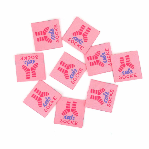 Hier ein Label in Rosa mit dem Text "coole Socke" und einem gestreiften Paar Socken.