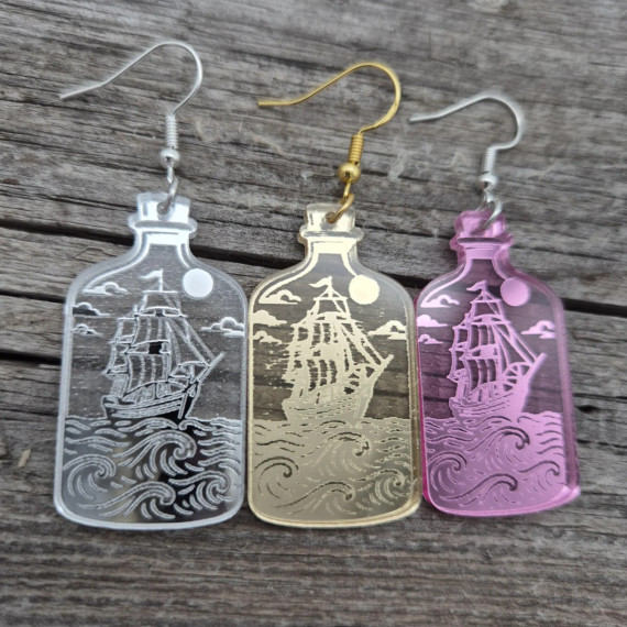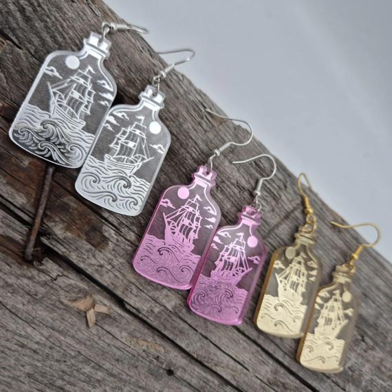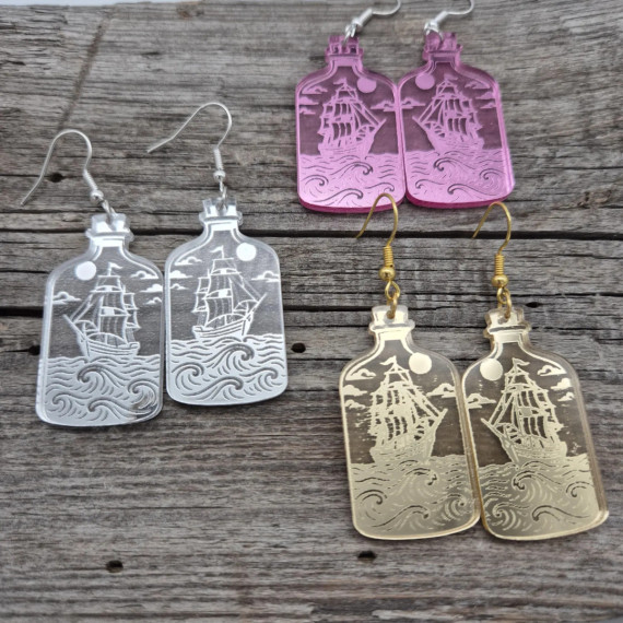 1 Paar Ohrringe - Buddelschiff - Flasche Schiff - Spiegel - leichte Acryl Ohrringe - Silber - Namensklang