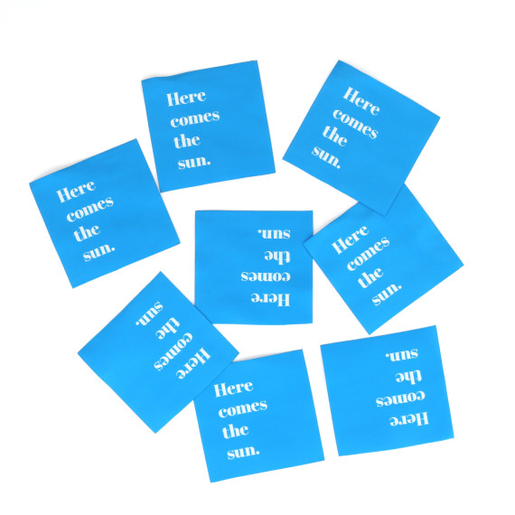 Hier ein super großes Label mit dem Text "Here comes the sun." auf einem