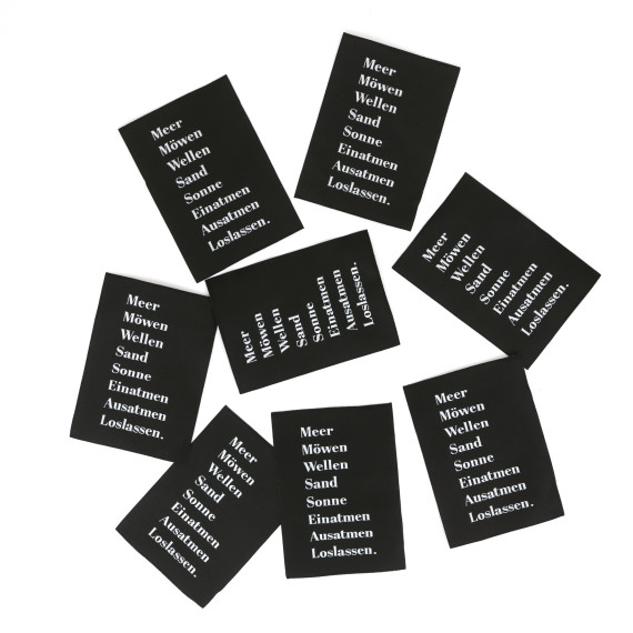 Hier ein super großes Label mit den Wörtern untereinander "Meer Möwen Wellen