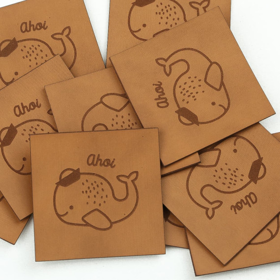 1 XXL Kunstleder Label in hellbraun mit der Aufschrift "Ahoi" und einem süßen Wal darunter :)