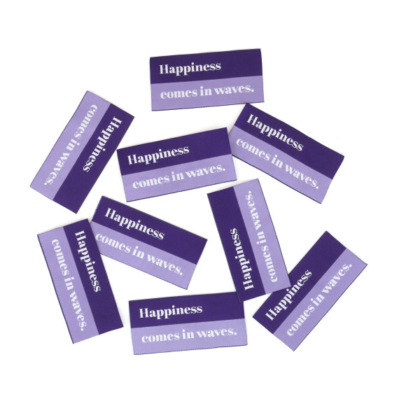 Hier ein farbigltes Label in Lila und Flieder mit dem Text "Happiness comes in waves." .