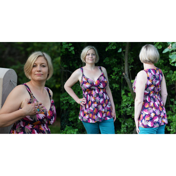 - Die beiden Vorderteile werden gekräuselt an die Träger angenäht. Jedes Vorderteil für sich setzt Deinen Busen – ähnlich einem BH – schön in Szene. Möchtest Du im Sommer keinen BH tragen, so kannst Du auch Cups in die beiden Vorderteile mit einnähen. Wie? Das erfährst Du in dieser Anleitung. Die beiden Vorderteile werden dann im Unterbrustbereich dezent überlappend zusammengenäht. Das gesamte Kleidoberteil wird an der unteren Kante mit Framilon gekräuselt und stabilisiert.