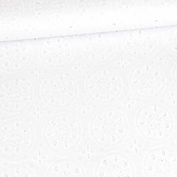 Baumwolle - Webware - Lochstickerei - Boho - Ornamentkreise - Weiß