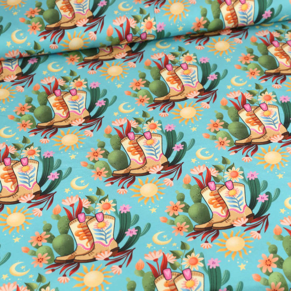Hier mit Cowgirlstiefeln, Kakteen, Sonnen und bunten Blumen auf einem cyanblauen Hintergrund.