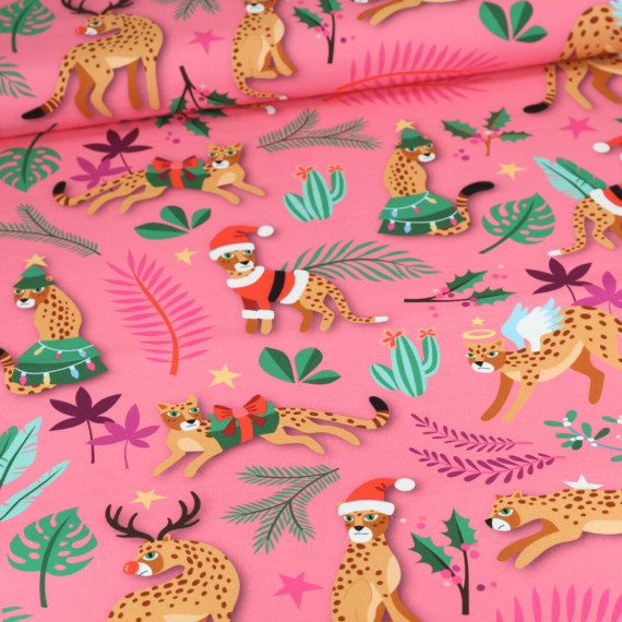 Toller Bio-Canvas mit weihnachtlich gekleideten Leoparden und bunten Blumen.