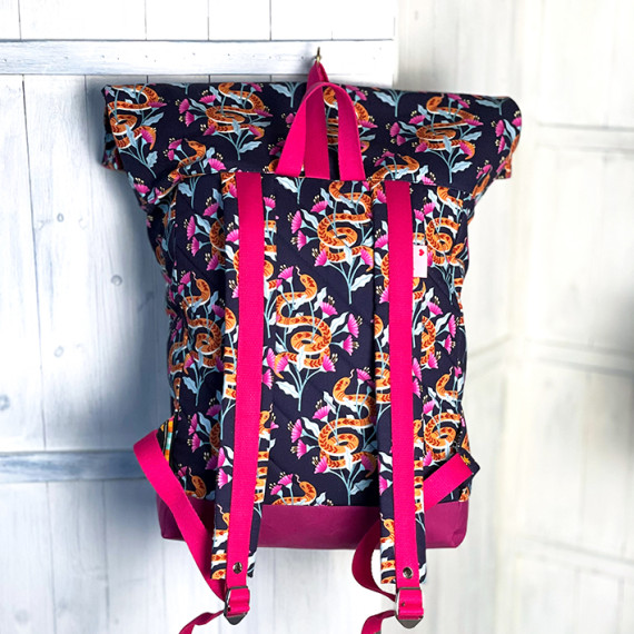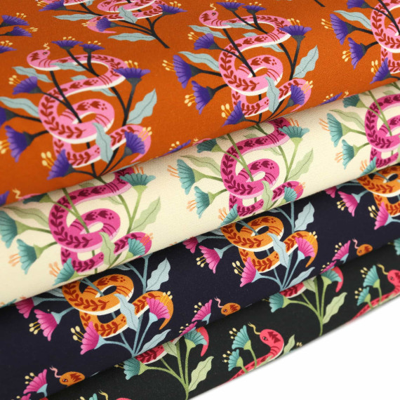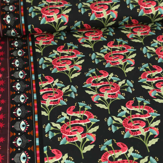 Toller Bio-Canvas mit bunten Schlangen und Blumen auf einem schwarzen Hintergrund.