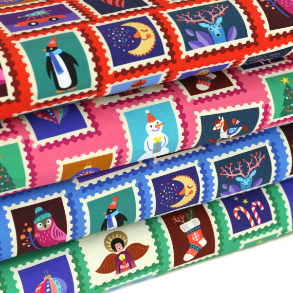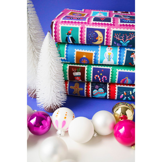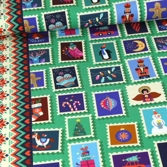 Hier mit vielen weihnachtlichen Briefmarken auf einem grünen Hintergrund.