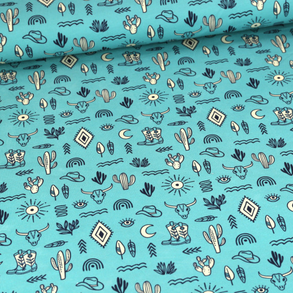 Hier mit vielen kleinen typischen Western-Motiven auf einem cyanblauen Hintergrund.
