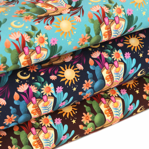 Hier mit Cowgirlstiefeln, Kakteen, Sonnen und bunten Blumen auf einem cyanblauen Hintergrund.