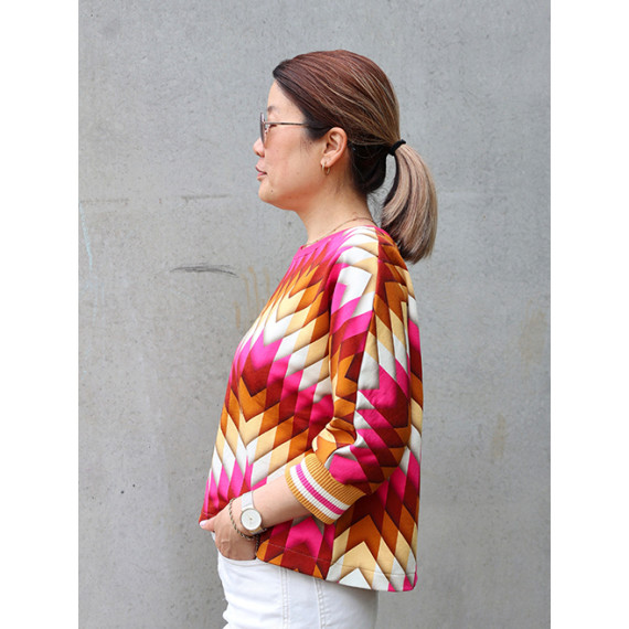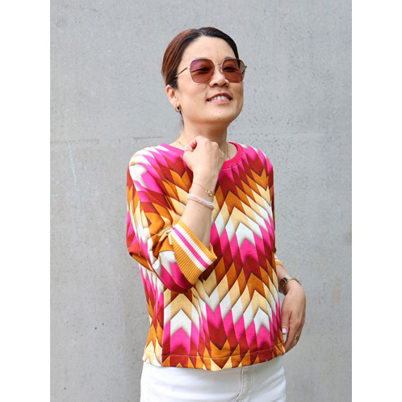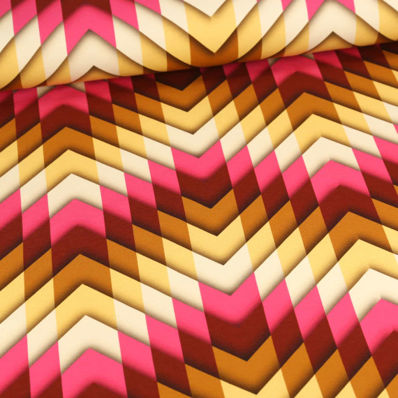 Hier mit einem geometrischen Zackenmuster in Bordeaux, Pink, Warmweiß, Altorange und Creme.