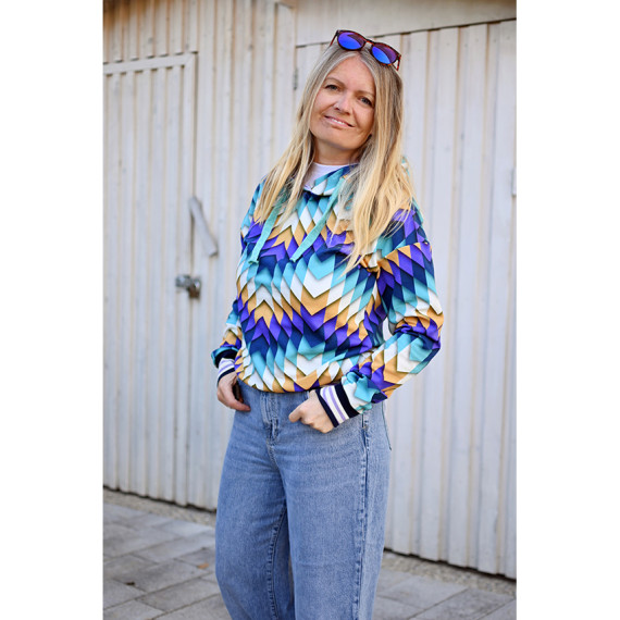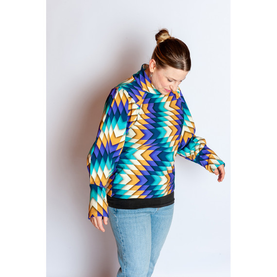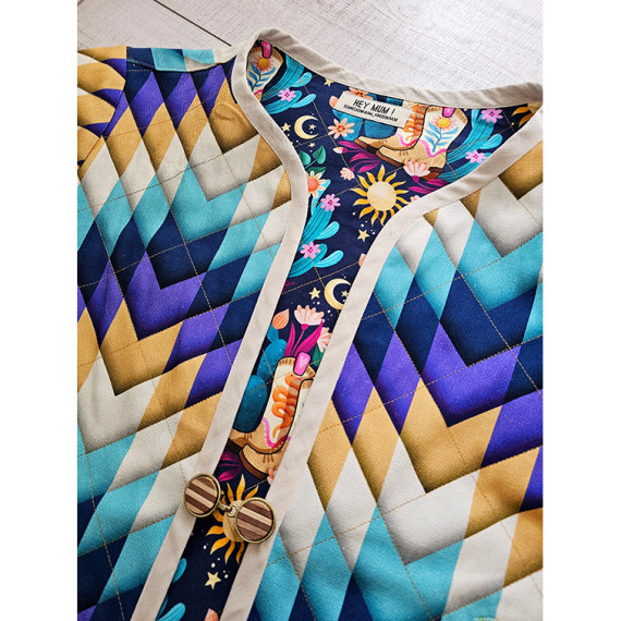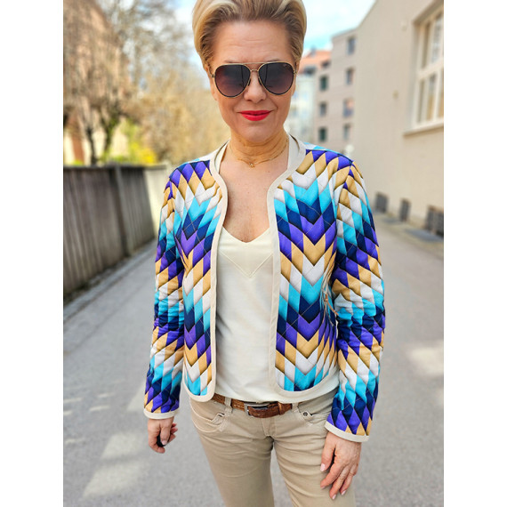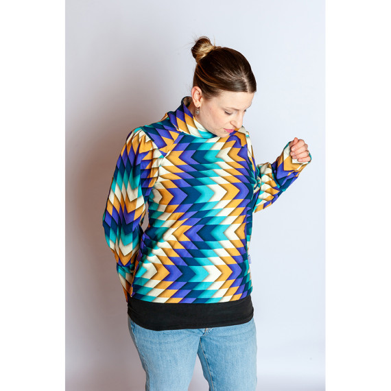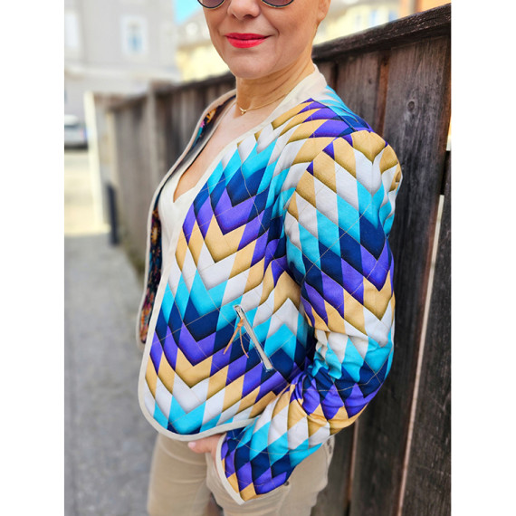 Hier mit einem geometrischen Zackenmuster in Lila, Dunkelblau, Cyanblau, Warmweiß und Hellbraun.