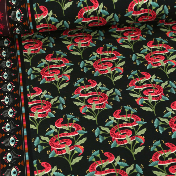 Hier mit bunten Schlangen und Blumen auf einem schwarzen Hintergrund.