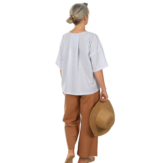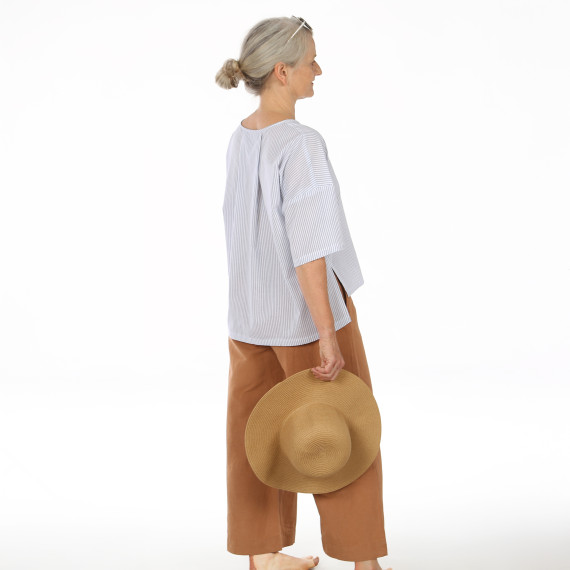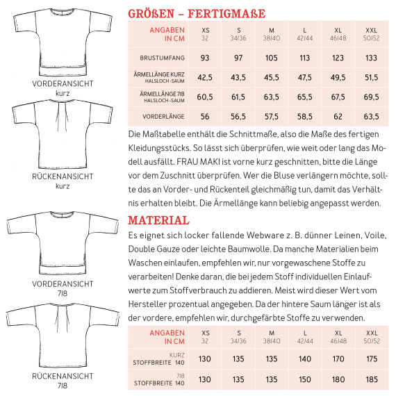- Materialempfehlung: locker fallende Webware z. B. dünner Leinen, Voile, Double Gauze oder leichte Baumwolle.