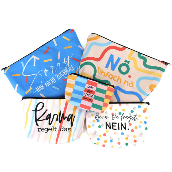 und das kleinste genähte Täschchen mit dem Schriftzug "CUTE, BUT PSYCHO." misst ca. 18cm x 11,5cm.