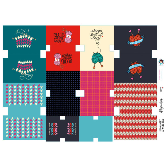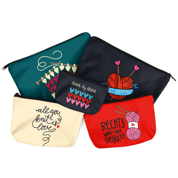 Wundervolles Nähset zum Nähen von 5 kleinen "Kosmetik" Täschchen mit Motive zum Thema Stricken unterschiedlichen Größen.