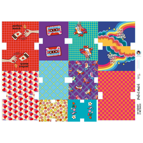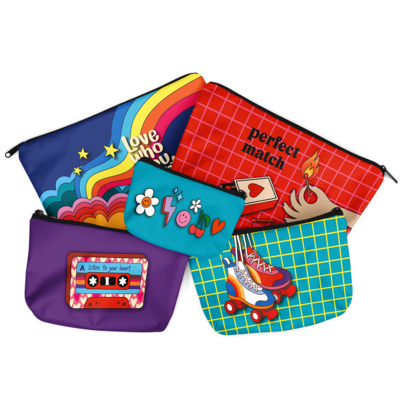 Wundervolles Nähset zum Nähen von 5 kleinen "Kosmetik" Täschchen mit süßen Motiven wie Rollerskates, Herzen, einer Kassette