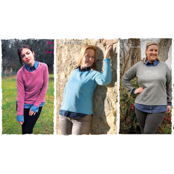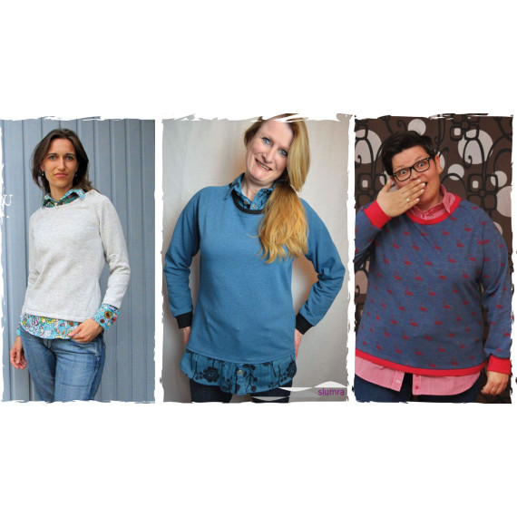 Paula ist ein Schnittmuster für einen Raglan Pulli mit Hemdfake. Genau, das Hemd ist nur ein Fake! Genäht werden muss hier nur der Kragen, der Saum und die Manschetten des Hemdes. Alles wird dann an den Pulli aus Sweat genäht.