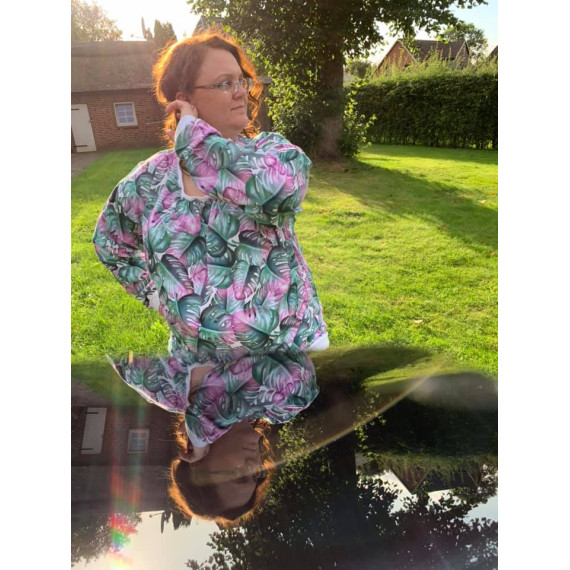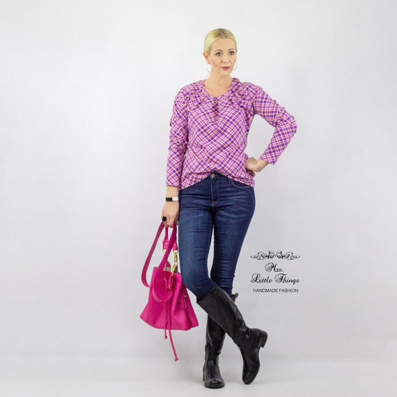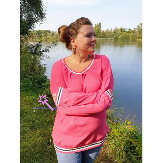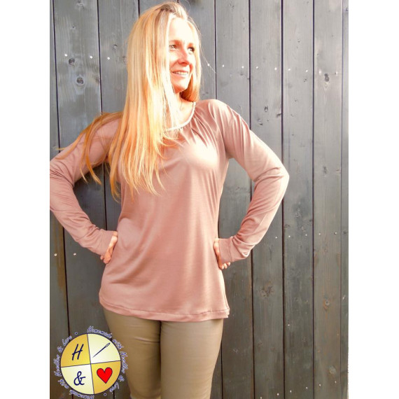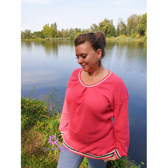 Das Modell ist leger und etwas länger geschnitten. Durch die raffinierten Falten und den Saumbund, lässt es das eine oder andere Pölsterchen im Bauchbereich einfach verschwinden.