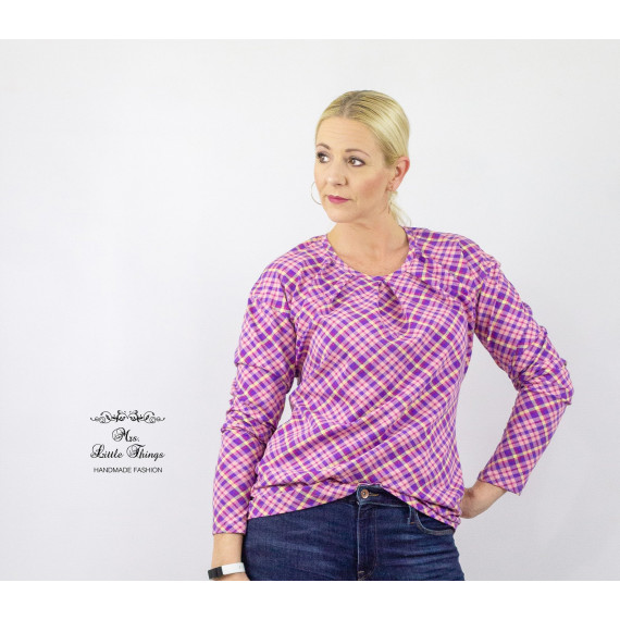 SANTA BARBARA ist ein sommerliches Oberteil mit Falten im Vorderteil. Der Schnitt enthält sowohl die kurzärmlige als auch die Langarmversion.