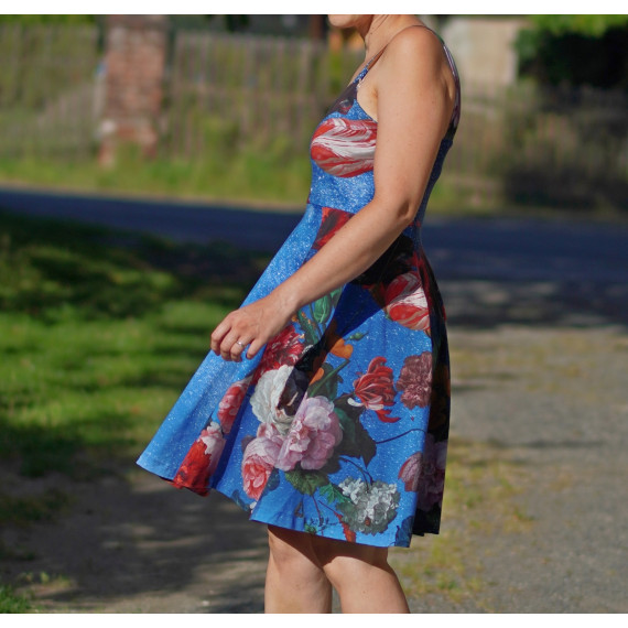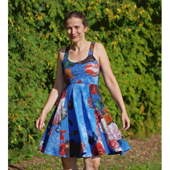 Gr.38 Länge bis zum kurz über dem Knie, mit Tellerrock aus 4 Sechsteln - 2 m Stoffverbrauch (blaues Kleid mit großen Rosen)