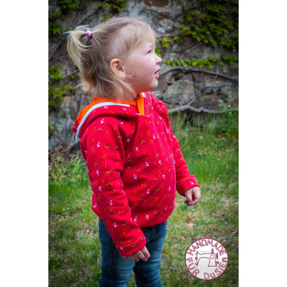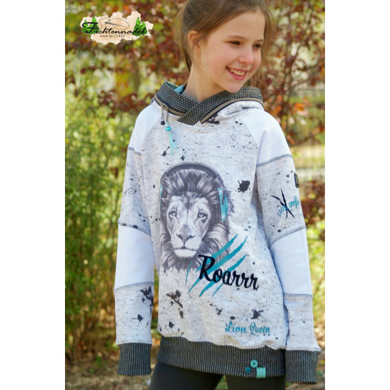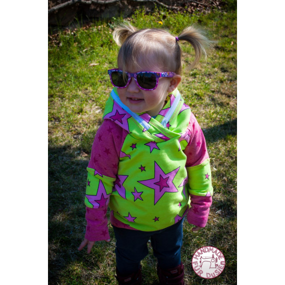 Little Lotte ist ein Raglan-Hoodie mit raffinierter Kapuze. Sie ist so geschnitten, dass du eine kleine Kragen-Kapuze hast, wenn der Reißverschluss geschlossen ist und eine kuschelige, weite Kapuze, wenn du den Reißverschluss öffnest. Mit den Teilungen am Arm machst du nochmal zusätzlich einen Hingucker draus.