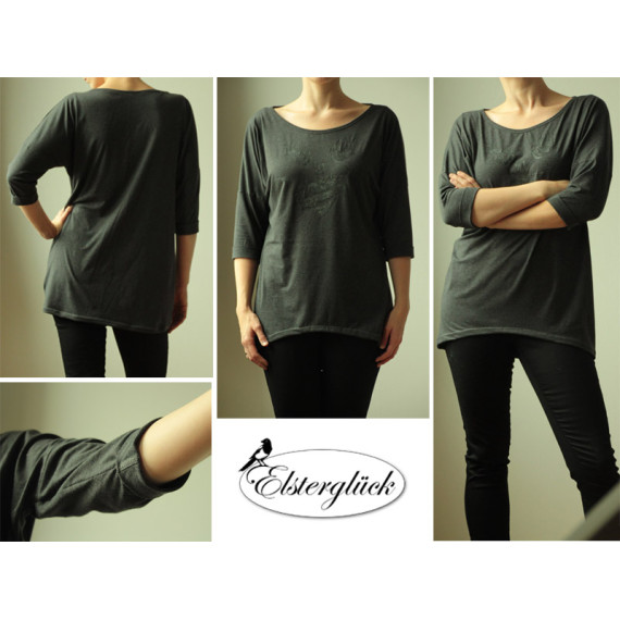Du kannst den lässigen Pulli aus dehnbarem Sweat-, Strick- oder Jerseystoff nähen - je nach Jahreszeit mit langen, dreiviertel oder kurzen Ärmeln. So kannst Du aus einem Schnitt mind. 4 verschiedene Varianten zaubern.