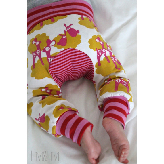 Diese Hose ist fix genäht und macht mächtig Eindruck durch den andersfarbigen Po Patch. Hier ist Mustermix angesagt. Da wird jedes Äffchen neidisch.