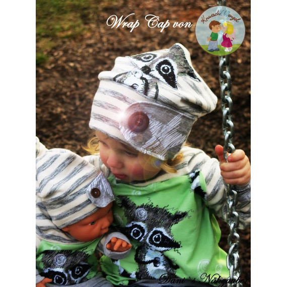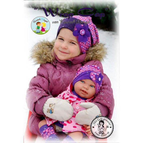 Das Ebook Wrap Cap beinhaltet eine ausführliche Anleitung & Schnittteile für einen Mützenschnitt mit Fake-Schnalle in den Doppelgrößen 39 cm bis 61 cm Kopfumfang – plus den Puppenschnitt für 36er und 43er Puppen, sodass die Puppenmuttis im Partnerlook mit ihren Puppen gehen können.